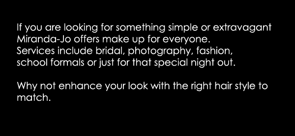 If you are looking for something simple or extravagant Miranda-Jo offers make up for everyone. Services include bridal make up, photography make up, fashion make up, make up for school formals or just for that special night out.
